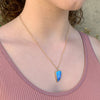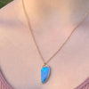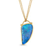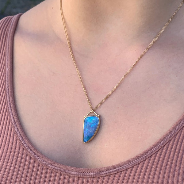 This is a once in a lifetime opal necklace, the size, sparkle and shape keep it in a class of its own. A solid natural Australian Opal is set in 14k yellow gold with a handmade gold bail and double wrapped 18" solid gold chain with lobster clasp. You wont be able to take your eyes of this beauty and neither will anyone else.