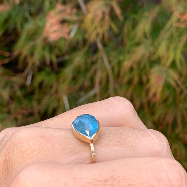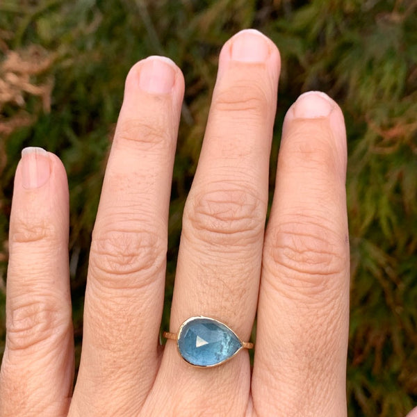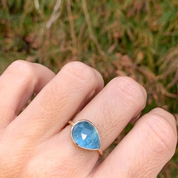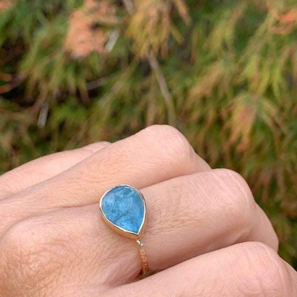 Set in 14k yellow gold this deep blue Aquamarine is truly captivating. Whether you are a March baby or just love the deep ocean coloring this piece is a perfect addition to your collection. Finished with Emily's solid gold hammered band