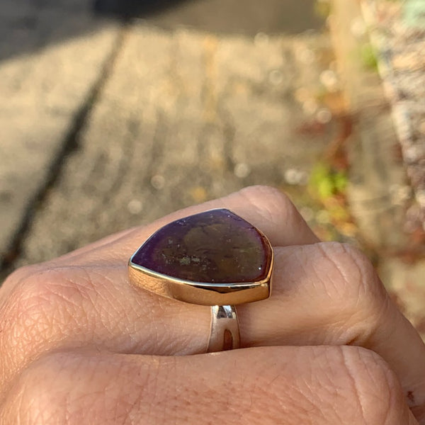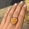 Usually we find these stones with a stripe of green and a pink center, this one is just as beautiful in shades of gold and pinks. Set in 14k yellow gold atop a hand carved sterling silver Sea Kelp band. (due to the width of the band we recommend sizing up 1/4-1/2 sizes when ordering.