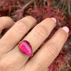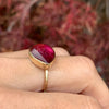 A beautiful pear shaped pink tourmaline is nestled in a 14k yellow gold bezel. Set atop our hammered gold band this vibrant stunner commands attention.