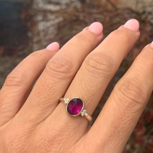 This color is absolutely exceptional! A deep pinky - purple rhodolite garnet is set in 14k gold with petite white diamond clusters atop a hand sculpted Sterling Silver band.