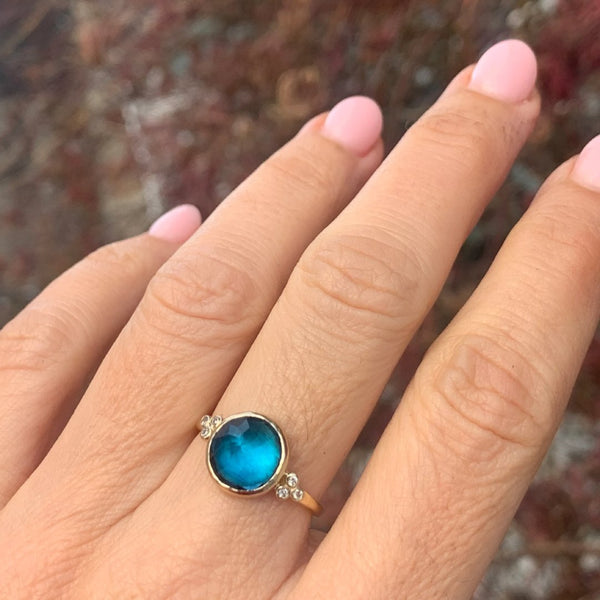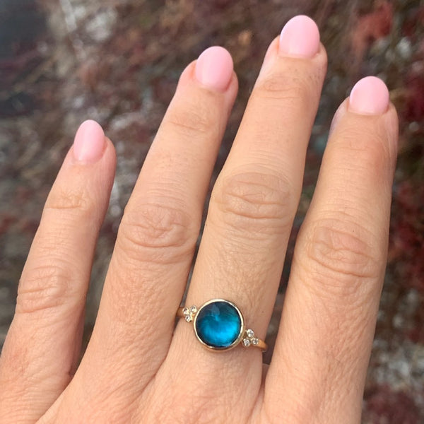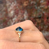 London Blue Topaz ring with white diamond clusters in 14k gold