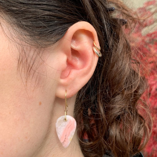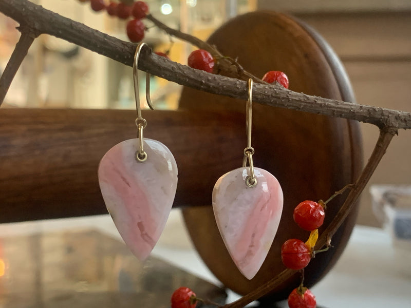 Rivers of opalized pinks and whites run through these hand cut and drilled Pink Opals. Hanging from solid gold ear wires we love these delicate beauties so very much.