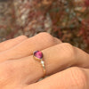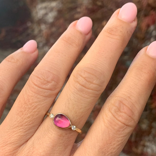 The vibrant magenta tourmaline cabochon sparkles with brilliant white diamonds accents. Set in 14k gold with Emily's handmade hammered gold band.