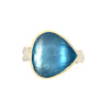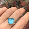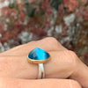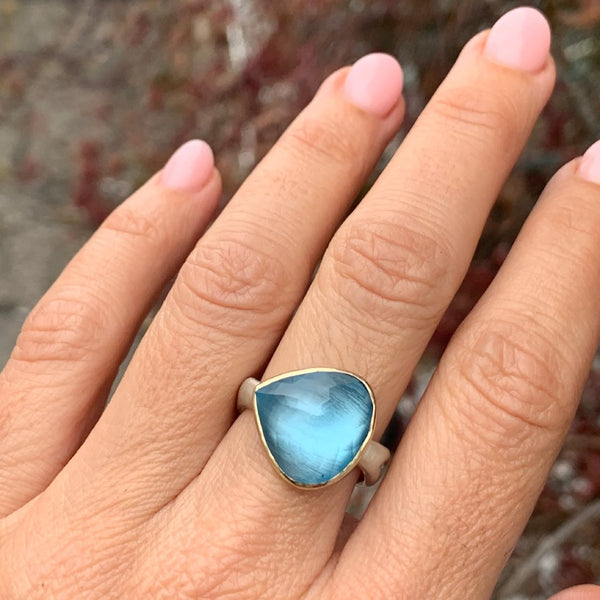 This electric blue pear shaped Topaz is so captivating we are all head over heels in love with it. Set in 14k gold with our hand carved wide Sea Kelp band in matte sterling silver. (due to the width of the band we recommend sizing up 1/4-1/2 sizes when ordering)