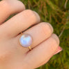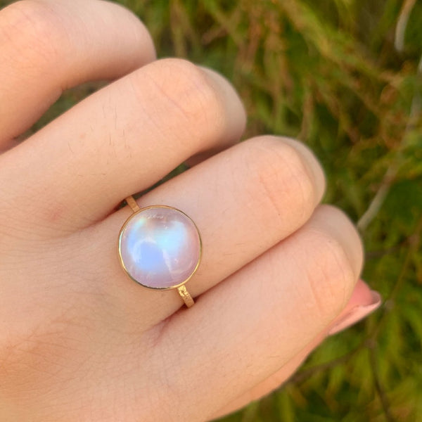 There is a rainbow flash from every angle in this sweet Round Moonstone Cab. Set on a handmade solid gold textured band it's destined to be a fixture on your hand for years to come.