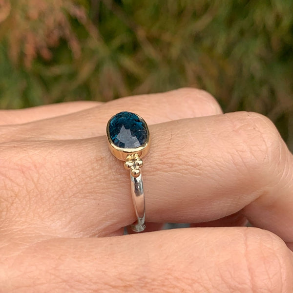 A deep teal kyanite is set in 14k yellow gold on sterling silver seagrass band with gold bead clusters.