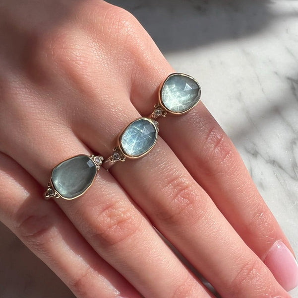 Emily hand picks the most beautiful rosecut aquamarines to set in a 14k gold bezel. A hand carved sterling silver freeform band with side 2mm diamonds and accent beads finish one of our most popular rings of all time.