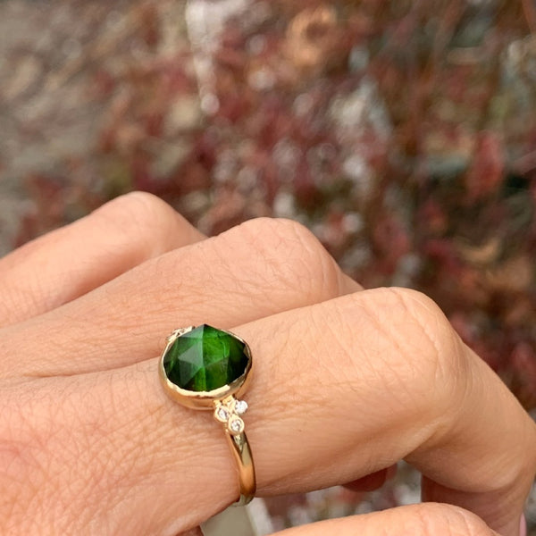 Set in 14k yellow gold this verdant green tourmaline is accented with brilliant white diamonds with a handmade gold hand sculpted band.