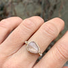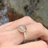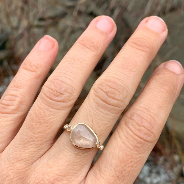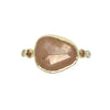 A peachy rosecut Sapphire is accented by two champagne garnets and white diamonds. Placed on a sterling silver hammered band and set in 14k yellow gold this beauty is sure to be a favorite.
