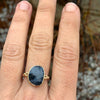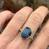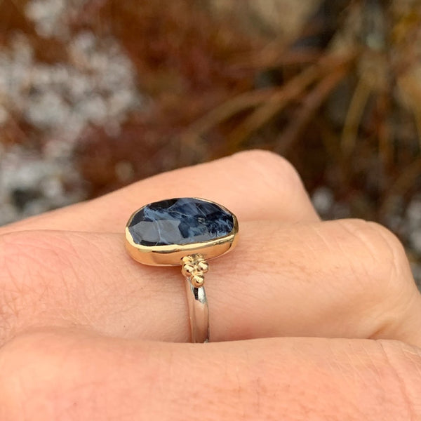 Found in Namibia in the 1960's this member of the chalcedony family is known for its unique patterns set off by quartz. Set in 14k gold with a handmade sterling silver nestle band and gold bead detailing. Eye catching enough to steal the show while being super comfortable.