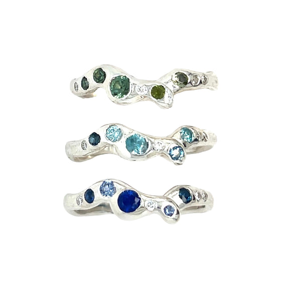 We had a client reach out asking for our much loved Octopus band with Vibrant Blue Zircons and once we saw how spectacular it was we had to add it to the collection! Speckled with shades of Teal Blue Zircons and petite white diamonds. Handmade in bright Sterling Silver