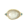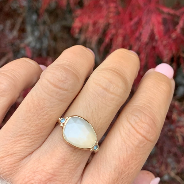 A cousin of our favorite rainbow moonstone, this luminous milky grey moonstone is reminiscent of a faceted pearl. Finished with a 14k yellow gold bezel and accent blue aquamarines it is finished with Emily's sterling silver seagrass band