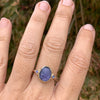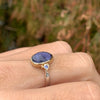 A vibrant purple Iolite is set between two deep purple Tanzanites. Set in 14k yellow gold with a sterling silver seagrass band this ring will quickly become a favorite.