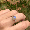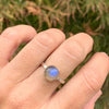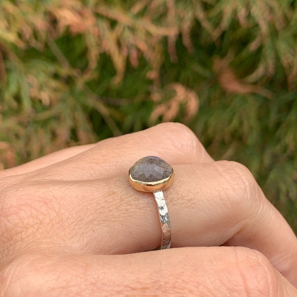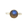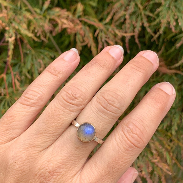 A flashy blue Labradorite is set in 14k gold accented by a hand textured sterling silver band