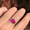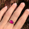 A magenta Ruby is set in 14k yellow gold on Emily's handmade sterling silver seagrass band. Accented with 3pt diamonds and gold beads this ring is a perfect everyday or special occasion piece.