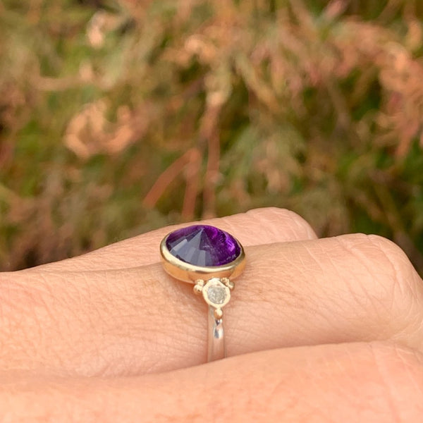 One of the most vibrant Amethysts we have come across, this cone rosecut gem is set in 14k yellow gold and a sterling silver seagrass band with rosecut salt and pepper diamonds.