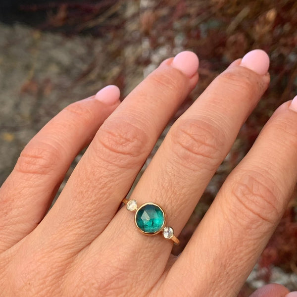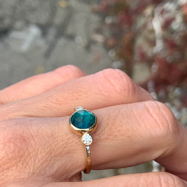 Wowza, this incredible rosecut teal tourmaline is accented by 2.5mm diamonds and is set in 14k gold with a hand textured gold band.