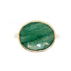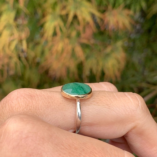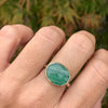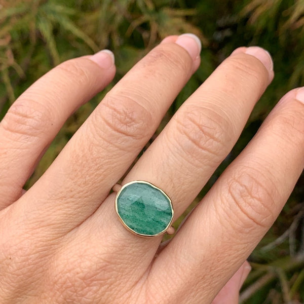 Such a unique stone, fuchsite threads run through this incredible quartz known as Kiwi quartz. Set in 14k gold with our comfortable handmade sterling silver nestle band.