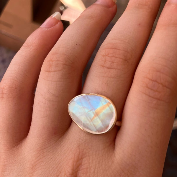 This is one of the most beautiful rings I have ever owned, a glowing moonstone with a prism cut edge to unleash the rainbow within. It is gorgeous.