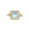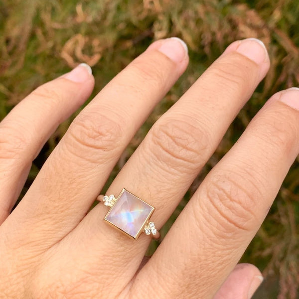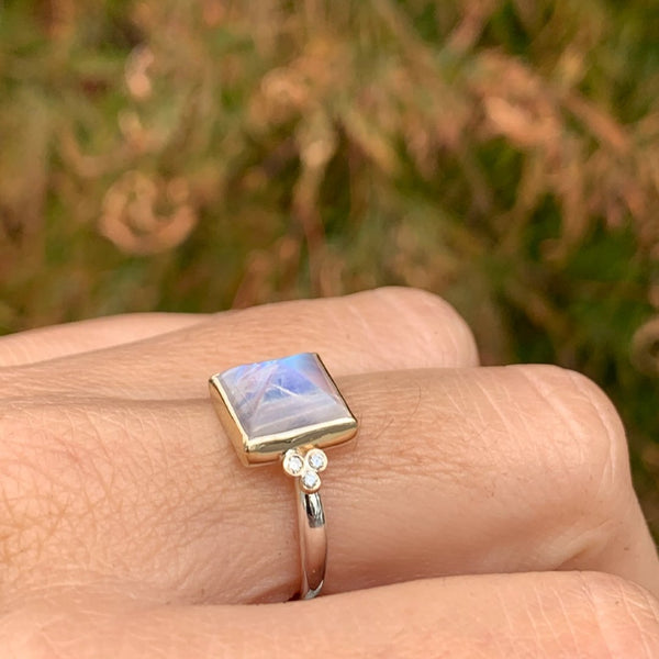 A flashy inverted princess cut rainbow moonstone is set in 14k yellow gold with petite white diamonds. Finished with a sterling silver seagrass band.