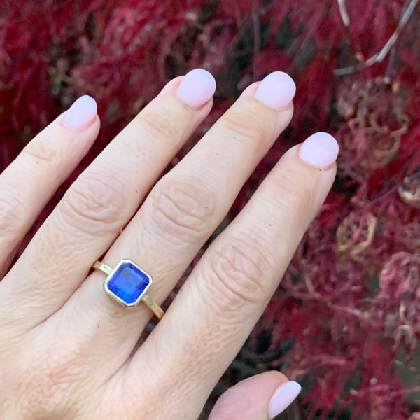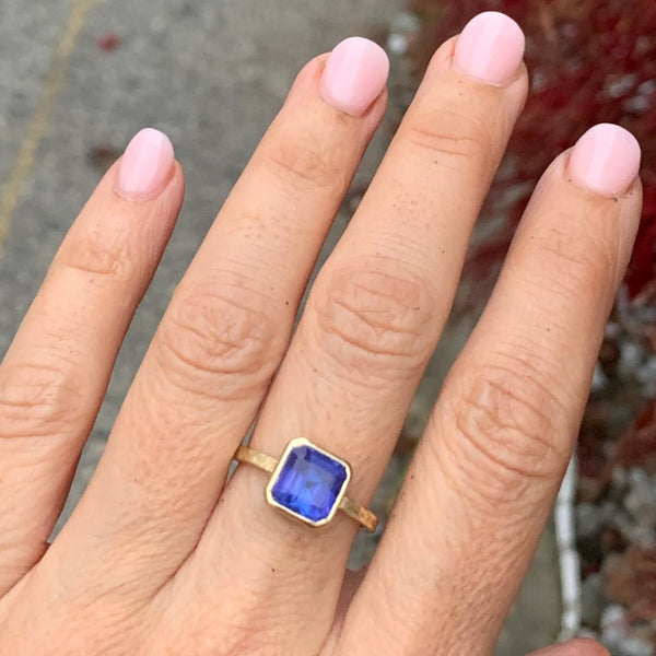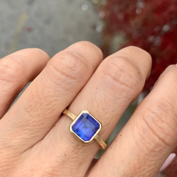 This deep purple tanzanite ring is a beautiful statement for everyday. A traditional Ascher cut it is set in our custom made brushed 14k setting. Finished on a hammered solid gold band, you won't want to take this little beauty off.