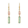Pastel pink and teal tourmalines are set in 14k yellow gold and delicately hang from handmade solid gold ear wires.