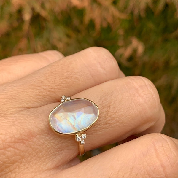 Rainbow Moonstone ring With White Diamond clusters in 14k gold