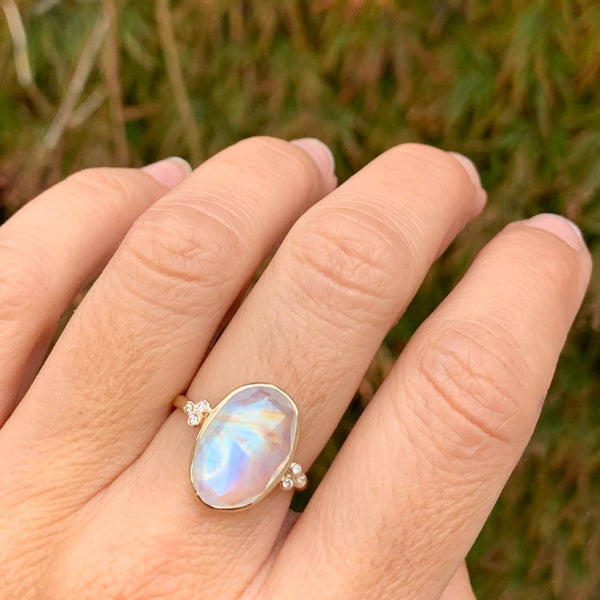 14k Rainbow Moonstone with diamond clusters ring