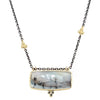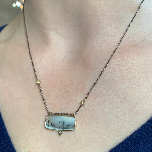 Set in buttery yellow 14k gold this stunning Dendritic Agate is accented with handmade bead accents and black diamonds. It hangs from a sterling silver chain hanging 17" with our handmade hook and eye clasp.