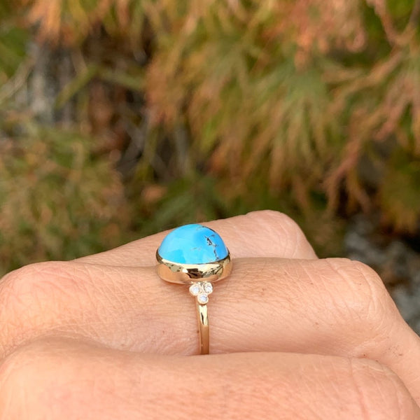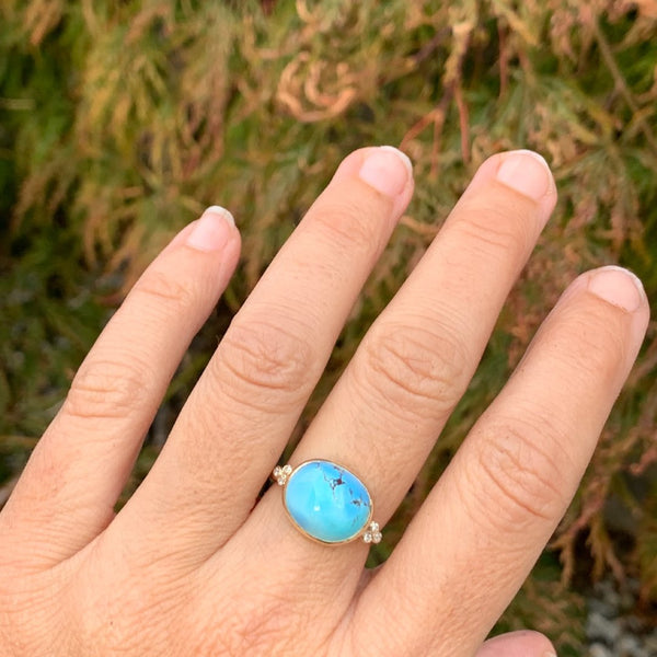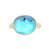 A matrix river runs though this incredible Golden Hill Turquoise from Kazakhstan. Set in 14k gold with petite white diamonds it is finished with a solid gold Ouroboros band.