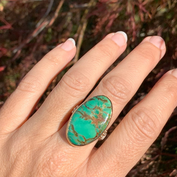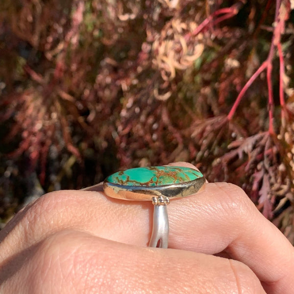 A cousin of the beloved Turquoise this incredible Variscite is set in 14k gold with gold beads and our hand carved Sea Kelp band in matte sterling silver. (due to the width of the band we recommend sizing up 1/4-1/2 sizes)