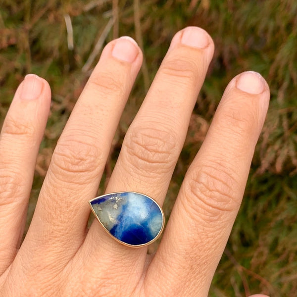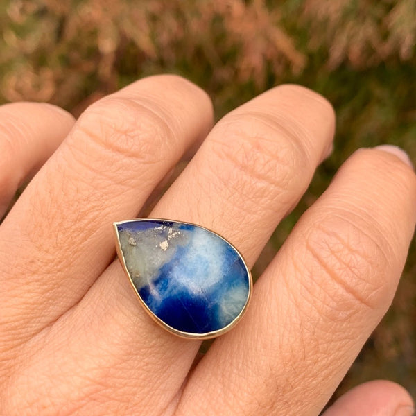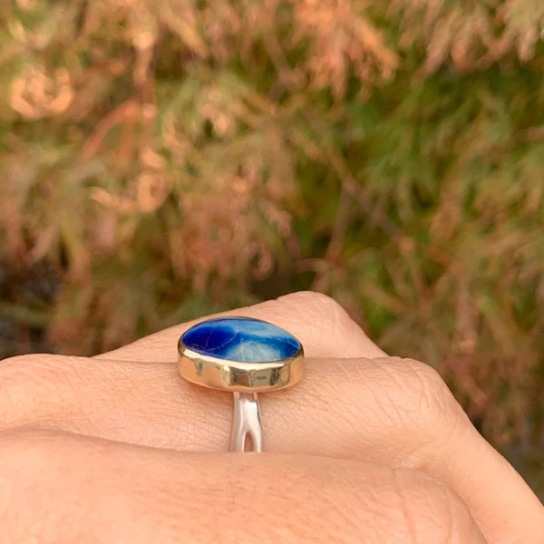 A cousin to the beloved Lapis, this incredible stone is swirls of deep blue cloudy white and metallic pyrite. Set in 14k gold with our handmade sterling silver sea kelp band. (due to the width of the band we recommend sizing up 1/4 to 1/2 sizes when ordering)