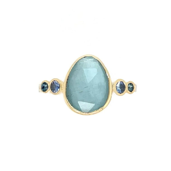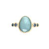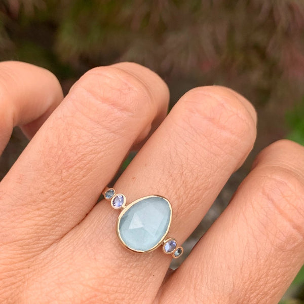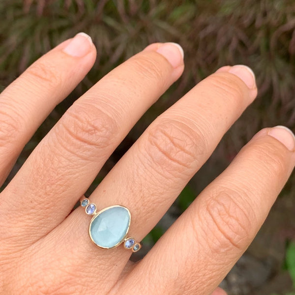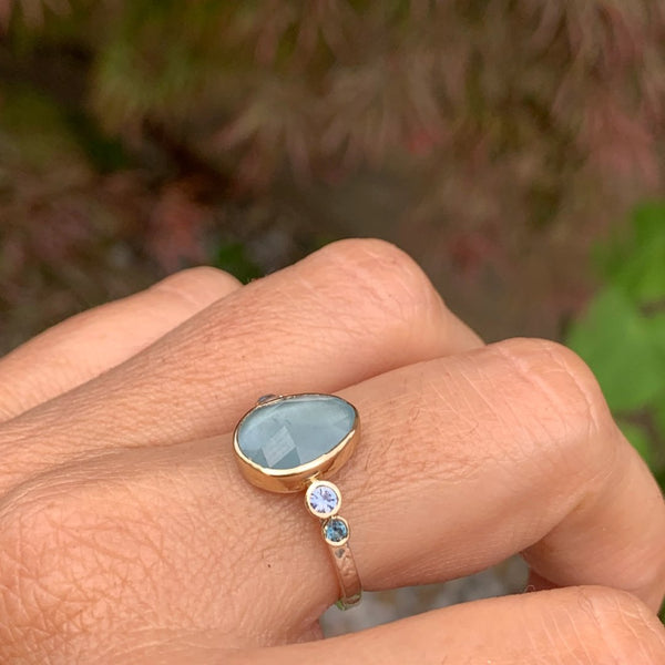 Set in 14k gold this blue aqua is flanked by blue zircons and sapphires. We finished this beauty on Emily's hammered band in sterling silver