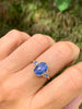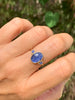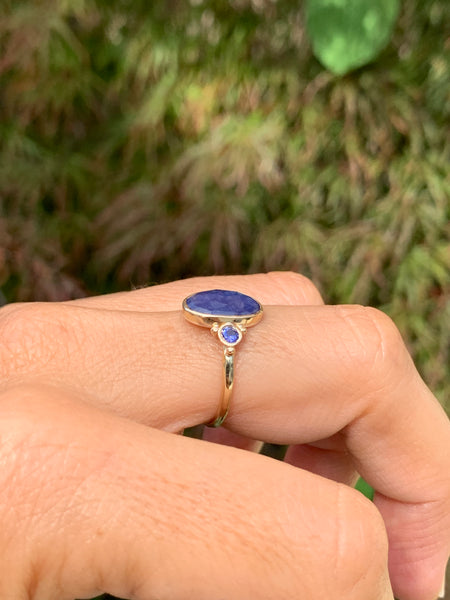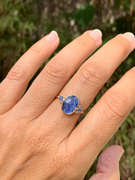 For those who have a thing for the color of royalty this indigo sapphire is accented with deep purple sapphires and gold beads. Finished with Emily's handmade seagrass band in solid 14k gold.