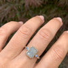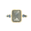 Unique sapphires are our current obsession, and this storm cloud colored rosecut is no exception. We accented it with Vibrant blue zircons and teal sapphires paying homage to the beauty of our skies no matter the weather. 14k yellow gold bezel and a sterling silver hammered band complete this very wearable piece.