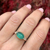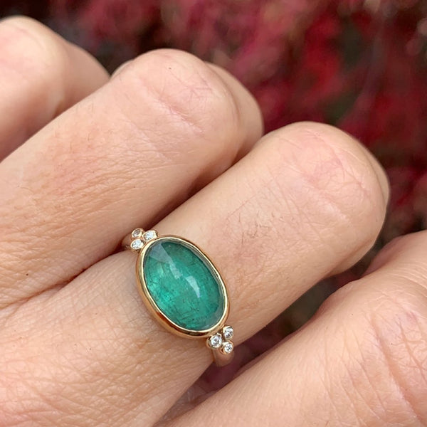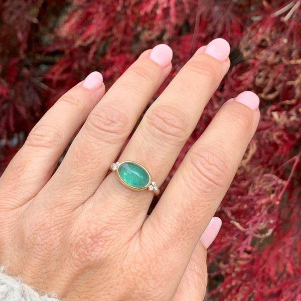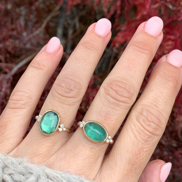 This beautiful ring features a Green Ocean Kyanite and is accented with Brilliant White Diamonds. Set in 14k yellow gold and finished on Emily's signature seagrass band in sterling silver.