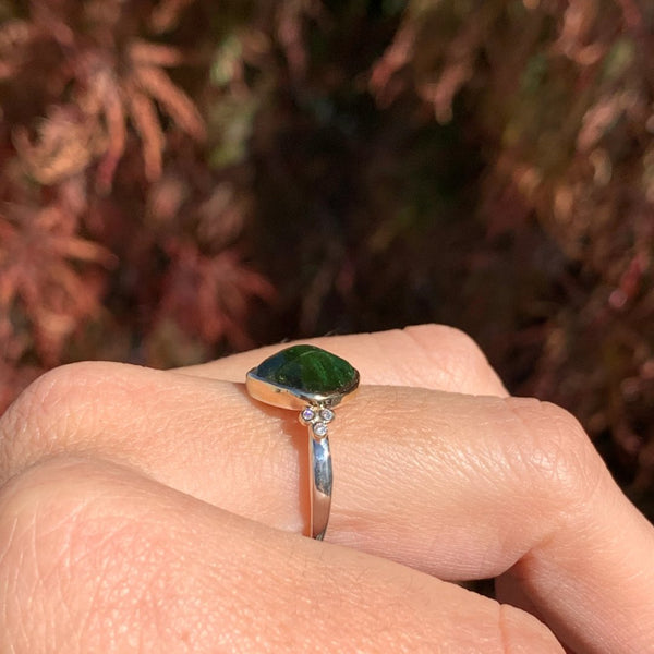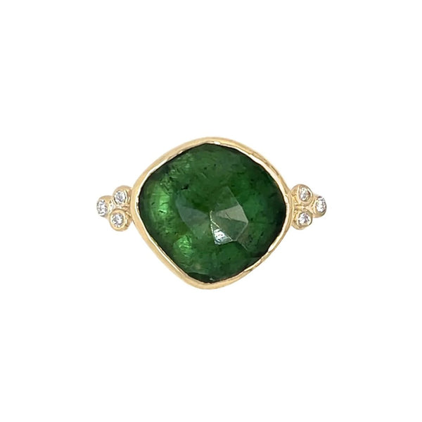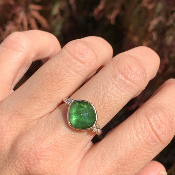 Deep Green Tourmaline ring with White Diamonds in 14k yellow gold
