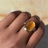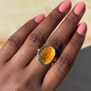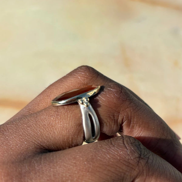 A light burnt orange Hessonite garnet is set in 14k yellow gold with our hand carved sterling silver sea kelp band. This ring is the perfect way to add a little fall to your life no matter what the season. (due to the width of the band we recommend sizing up 1/4-1/2 sizes when ordering)