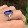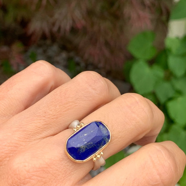 We love this Sublime Lapis set in 14k yellow gold, accented with gold beads. Sitting beautifully on a handmade Sterling Silver Sea Kelp Band, you willnot want to take this beauty off! (due to the width of the band we recommend sizing up 1/4-1/2 sizes when ordering)