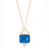 A vibrant Emerald cut London Blue Topaz set inverted to highlight its dramatic depth is suspended from a 17" gold chain with lobster clasp. It is accented by a cluster of brilliant white diamonds and handmade gold bail.