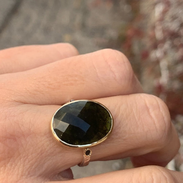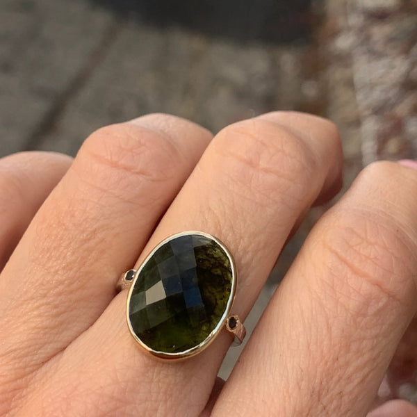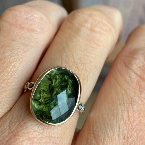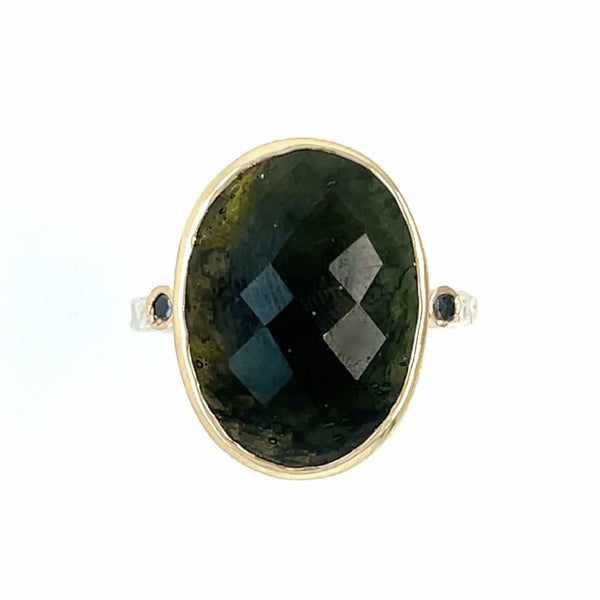 Set in 14k yellow gold this amazing faceted Moldavite features an almost boytrodial structure adding visual interest to an already powerful stone. Finished with petite black diamonds and a 2mm wide sterling silver textured band this ring is sure to bring a new energy to your life.