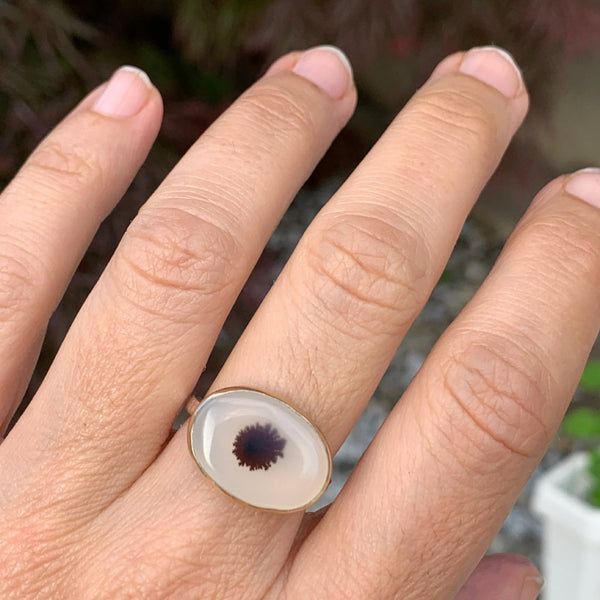 A burst of black deep within a milky white Montana Agate is set in 14k yellow gold with our handmade hammered band in sterling silver.