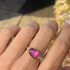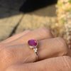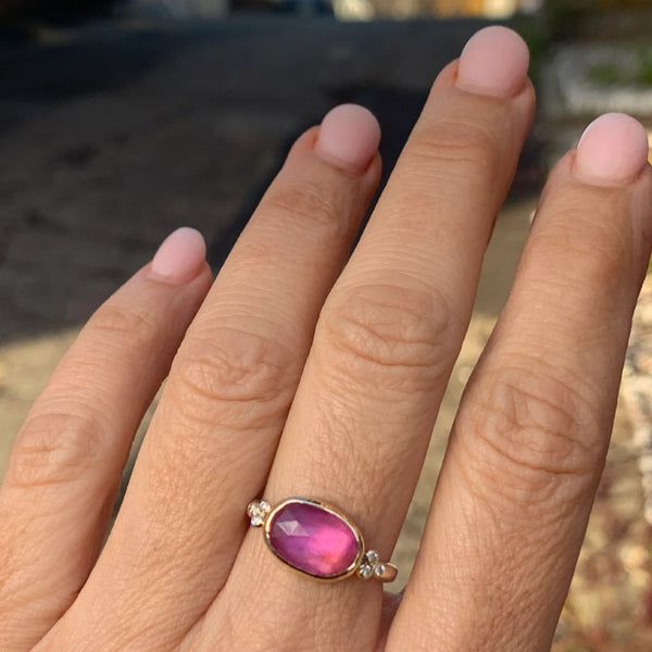 Our pink rosey ruby ring is handcrafted with a 14k bezel and a sterling silver seagrass band. We accented this beauty with gold beads and brilliant cut white diamonds.