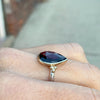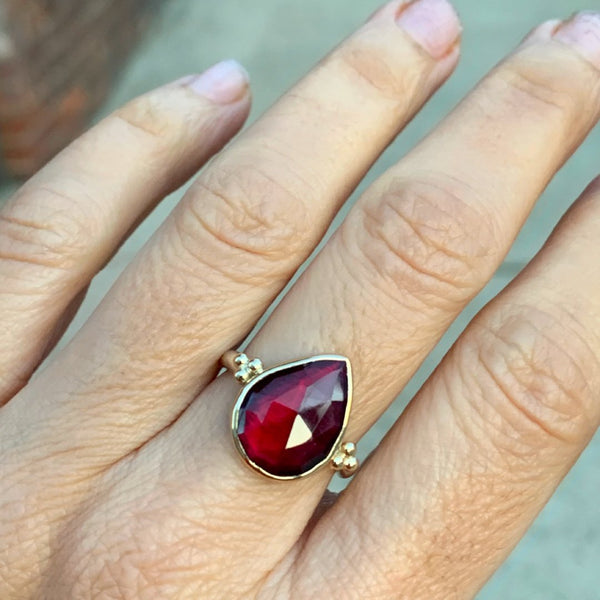 A deep Burgundy Rhodolite garnet is set in 14k yellow gold with handmade gold granulation and our signature sterling silver nestle band.