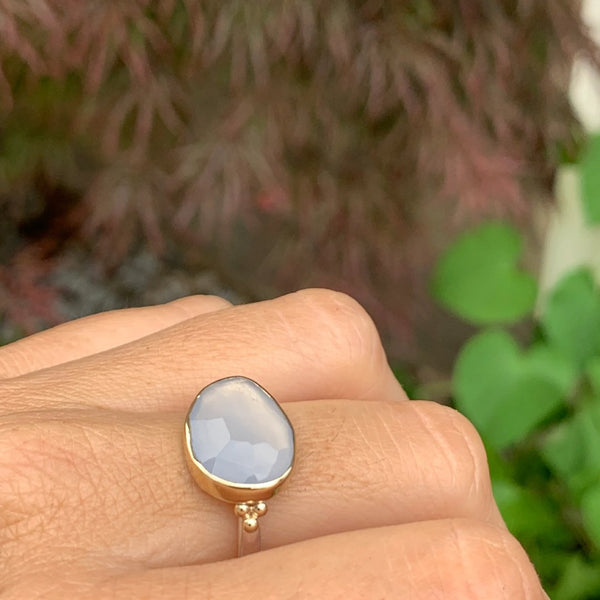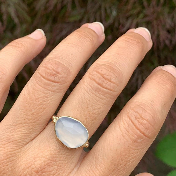 This ring is beyond gorgeous. It glows from within with transcendent light and the organic shape is beautifully framed with the symmetrical signature gold beads. Most beautiful chalcedony stone and cut I have ever seen.